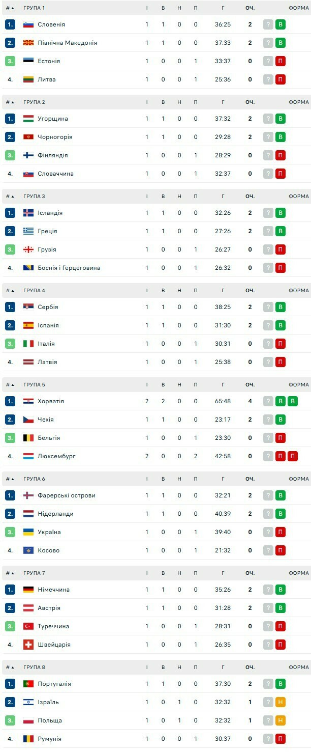 В группе 6 также выступают сборные Фарерских островов и Косово (их матч в первом туре завершился со счетом 32:21).