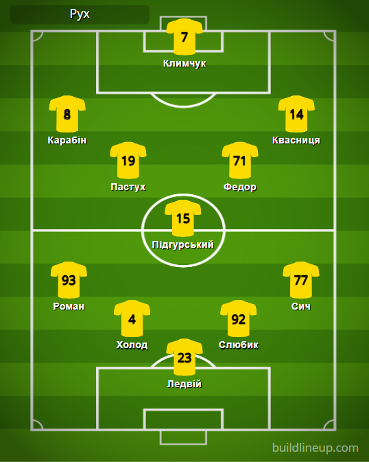«Рух»: Ледвий – Роман, Холод, Слюбик, Сыч – Пастух, Пидгурский (Притула, 69), Федор – Карабин (Клайвер, 61), Климчук (Краснопир, 61), Квасница (Рунич, 68).