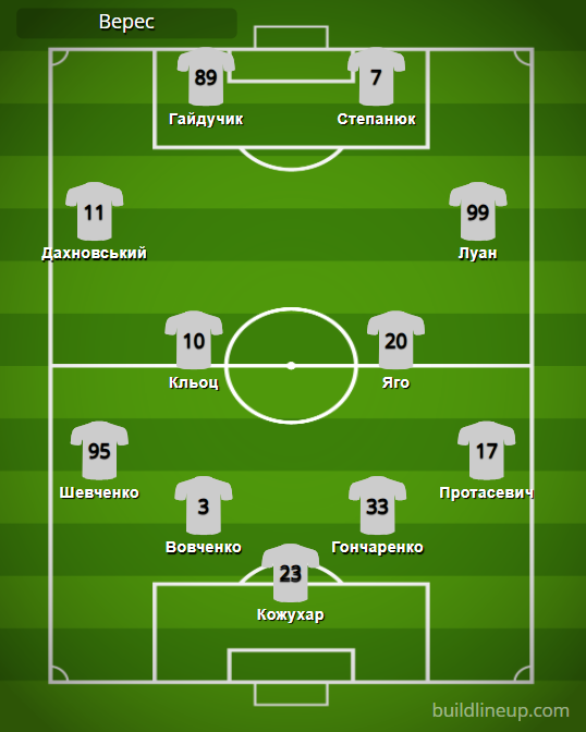 «Верес»: Кожухарь – Шевченко, Вовченко, Гончаренко, Протасевич – Клец (Баран, 90+4), Яго – Дахновский (Годя, 75), Луан – Гайдучик (Мрвалевич, 75), Степанюк.