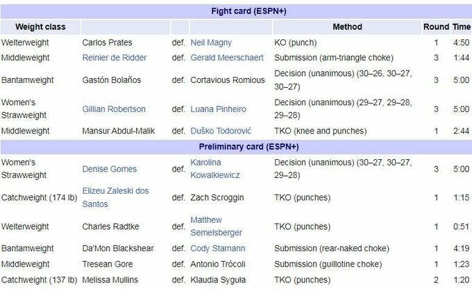 Главным событием стал поединок в полусреднем весе (до 77,1 кг) между американцем Нилом Магни (29-12) и бразильцем Карлосом Пратесом (20-6).