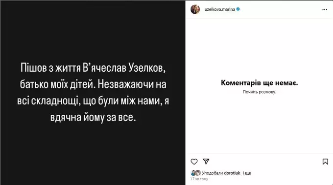 «Ушел из жизни Вячеслав Узелков, отец моих детей. Несмотря на все сложности, что были между нами, я благодарна ему за все», – написала Марина на своей странице в Инстаграм.