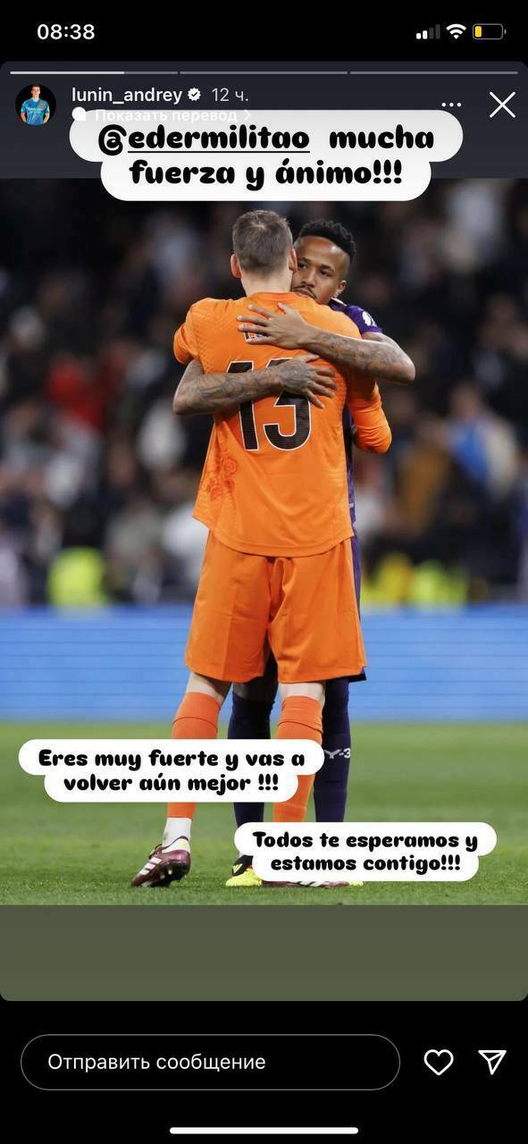 Украинский голкипер мадридского «Реала» Андрей Лунин поддержал своего одноклубника Эдера Милитао, получившего тяжелую травму в матче против «Осасуны» в Ла Лиге.