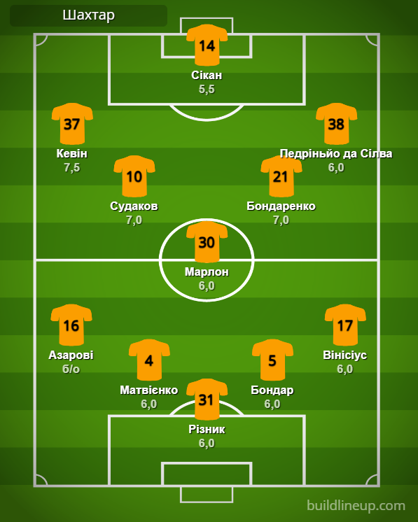 «Шахтер»: Резник – Азаров (Педриньо Азеведо, 32), Матвиенко, Бондарь, Винисиус – Судаков, Марлон, Бондаренко (Крыськив, 72) – Кевин (Эгиналду, 83), Сикан (Траоре, 82), Педриньо да Силва (Зубков, 72).