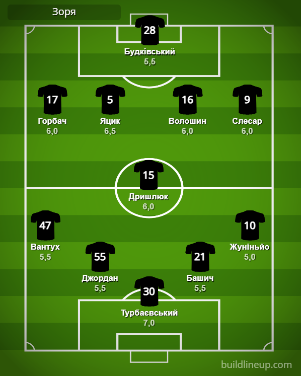 «Заря»: Турбаевский – Вантух, Джордан, Башич, Жуниньо (Супряга, 88) – Дрышлюк – Горбач (Волошин, 71), Яцык, Мичин (Кирюханцев, 71), Слесар (Тронтель, 76) – Будковский.