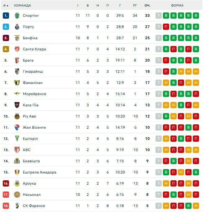 Турнирное положение лидеров: Спортинг (33 очка), Порту (27), Бенфика (25).