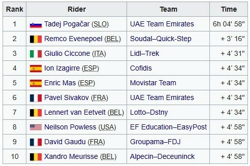Бельгиец Ремко Эвенпул из команды Soudal-Quick-Step отстал на 3 минуты 16 секунд. Третьим финишировал итальянец Джулио Чикконе из Lidl-Trek (+4.31).