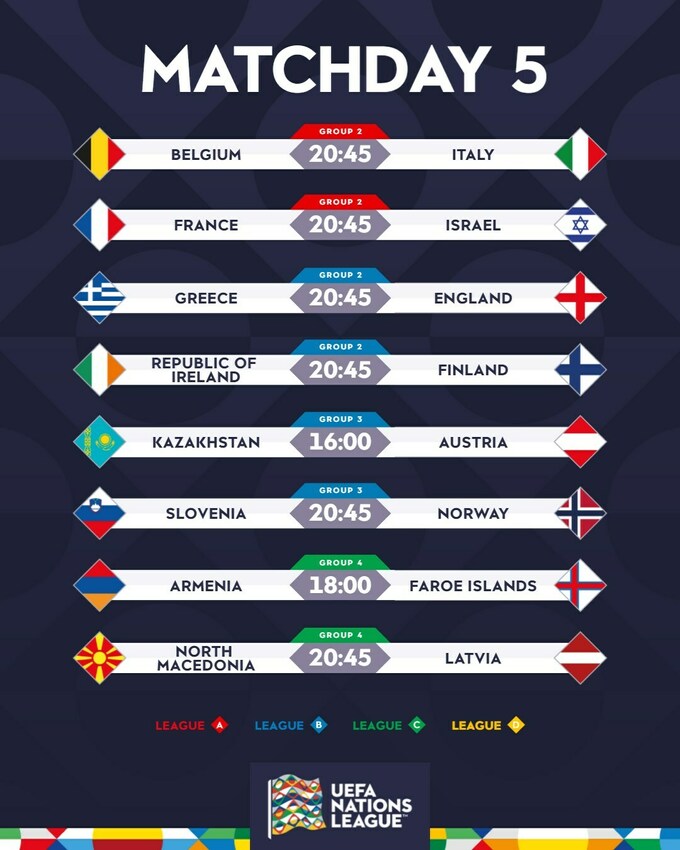 Вечером 14 ноября проходят поединки 5-го тура Лиги наций.