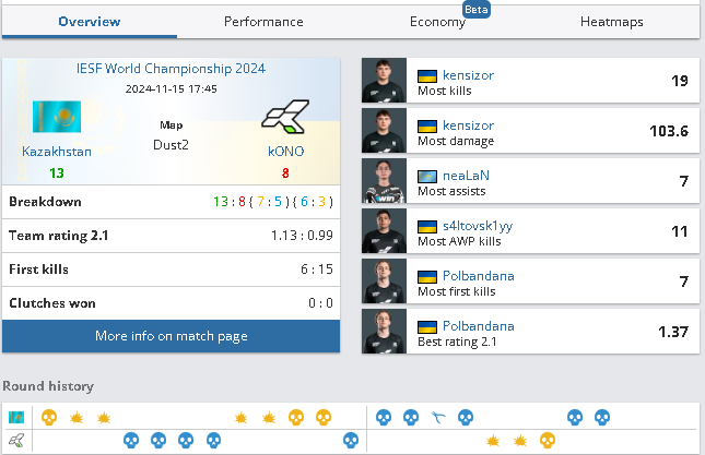 Сегодня, 15 ноября, сборная Украины сыграла свой последний матч на турнире World Esports Championship. Матч против Казахстана оказался трудным для наших ребят и карта Dust 2 закончилась со счетом 8:13.