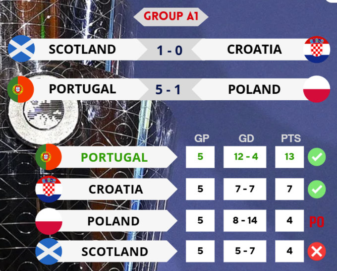 Сборная Португалии разгромила команду Польши со счетом 5:1 и досрочно стала победителем группы A1 (13 очков из 15). Португальцы присоединились к числу четвертьфиналистов турнира.