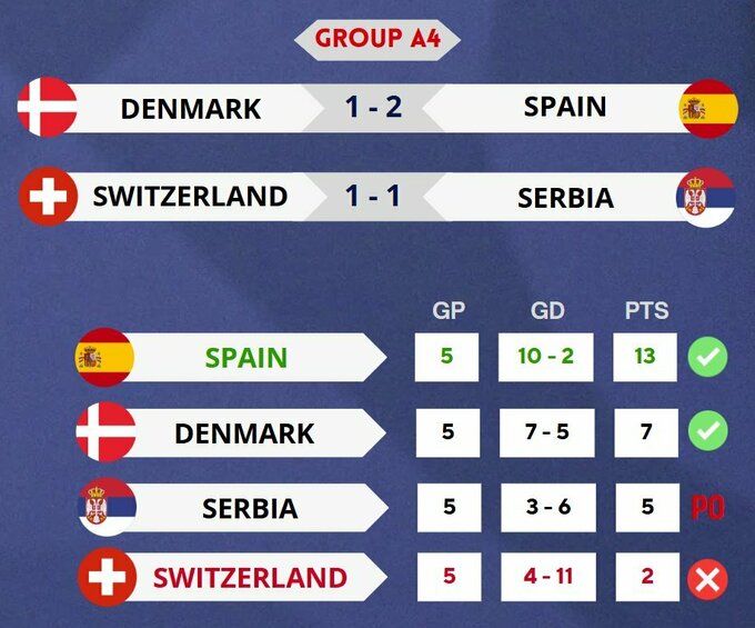 Испания на выезде одолела Данию (2:1) и убедительно выиграла группу. В матче Швейцарии и Сербии зафиксирована ничья (1:1), в результате чего сербы сохранили шансы на выход в плей-офф, а сборная кантонов понижается в классе в Дивизион B.