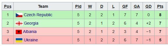 Ситуация в группе: 1. Чехия (8 очков), 2. Грузия, 3. Албания (по 7 баллов), 4. Украина (5 пунктов).