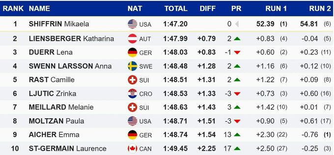 Удержала первую строчку после первой попытки американка Микаэла Шиффрин. Спортсменка в 98-й раз одержала победу на Кубке мира.