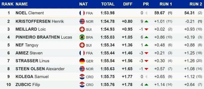 Победу в соревновании одержал французский спортсмен Клеман Ноэль. Ему удалось опередить норвежца Хенрика Кристофферсена на 0.80 секунд, занявшего вторую строчку. Представитель Норвегии после второй попытки поднялся из топ-15 на пьедестал.