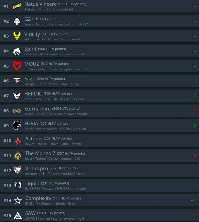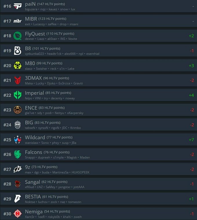 - FURIA улучшила свои показатели благодаря мощной игре в последних турнирах (+2 позиции).