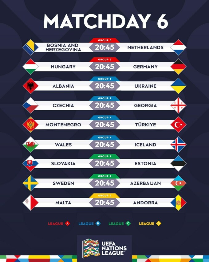 Вечером 19 ноября проходят поединки 6-го тура Лиги наций.