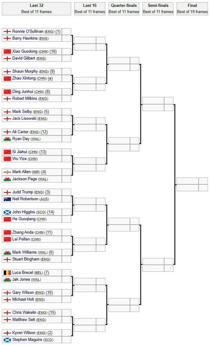 В 1/16 финала зрители увидят несколько интересных дуэлей: Ронни О'Салливан будет играть против Барри Хокинса в ремейке финала ЧМ-2013, Марк Селби встретится с Джеком Лисовски, соперником Джадда Трампа будет австралиец Нил Робертсон, успешно преодолевший квалификацию.