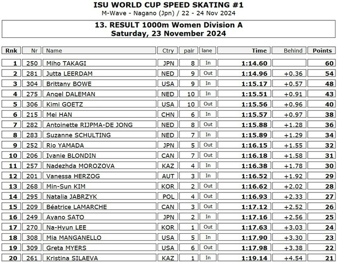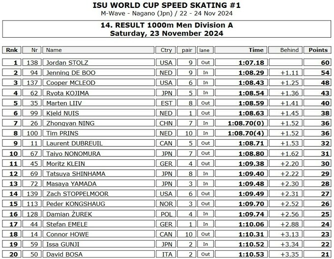 Американец Джордан Столц обновил очередной рекорд трека – на этот раз на дистанции 1000 метров. Он показал время 1:07.18 и стал первым, кто на овале в Нагано выбежал из 1 минуты и 8 секунд на этой дистанции. Нидерландец Йеннинг де Бо, который показал второе время, проиграл Столцу 1.11 секунды. Замкнул первую тройку еще один конькобежец из США Купер Маклауд, который проиграл своему коллеге по сборной 1.25 секунды.