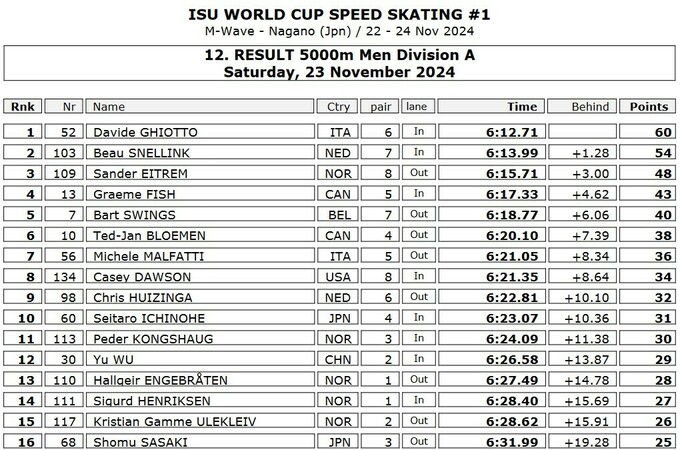 Еще один рекорд трека установил итальянский специалист по длинным дистанциям Давиде Гьотто, который выиграл гонку на 5000 метров – 6:12.71. Гьотто стал первым конькобежцем, который на этой дистанции на овале «M-Wave» выбежал из 6 минут и 13 секунд. Второе место занял нидерландец Бо Снеллинк, который проиграл Гьотто 1.28 секунды. Замкнул первую тройку Сандер Айтрем и Норвегии с отставанием ровно в три секунды от победителя.