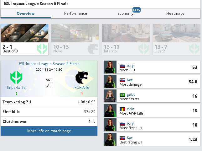 Бразильская команда FURIA fe, пропустившая финалы в Далласе шесть месяцев назад, выиграла первую карту серии и даже вернулась после 0:7 во второй, но не смогла завершить матч в свою пользу. В решающей Dust2 опыт Imperial fe оказался решающим: команда выиграла важный экономический раунд благодаря четырём фрагам Александры «twenty3» Тимониной и завершила игру уверенно.