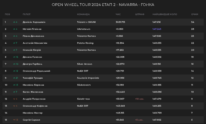Гонка в Наварре стала подлинным испытанием для всех участников. Антоний Максимюк (Potato Racing) поднялся на семь позиций и завершил гонку четвертым, продемонстрировав поразительную стойкость и адаптацию к условиям трассы. Не менее впечатляющим был прорыв Данила Голенко (Silver Arrows), поднявшийся на 16 позиций и финишировавший шестым.