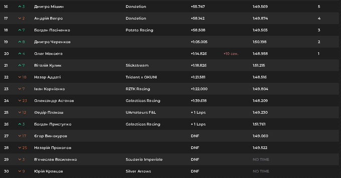 В нижней части таблицы мы увидели драматические события: несколько пилотов не смогли финишировать из-за технических проблем и ошибок на трассе. Назарий Прокопов (Scuderia Imperiale) и Юрий Кравцов (Silver Arrows) завершили гонку досрочно.