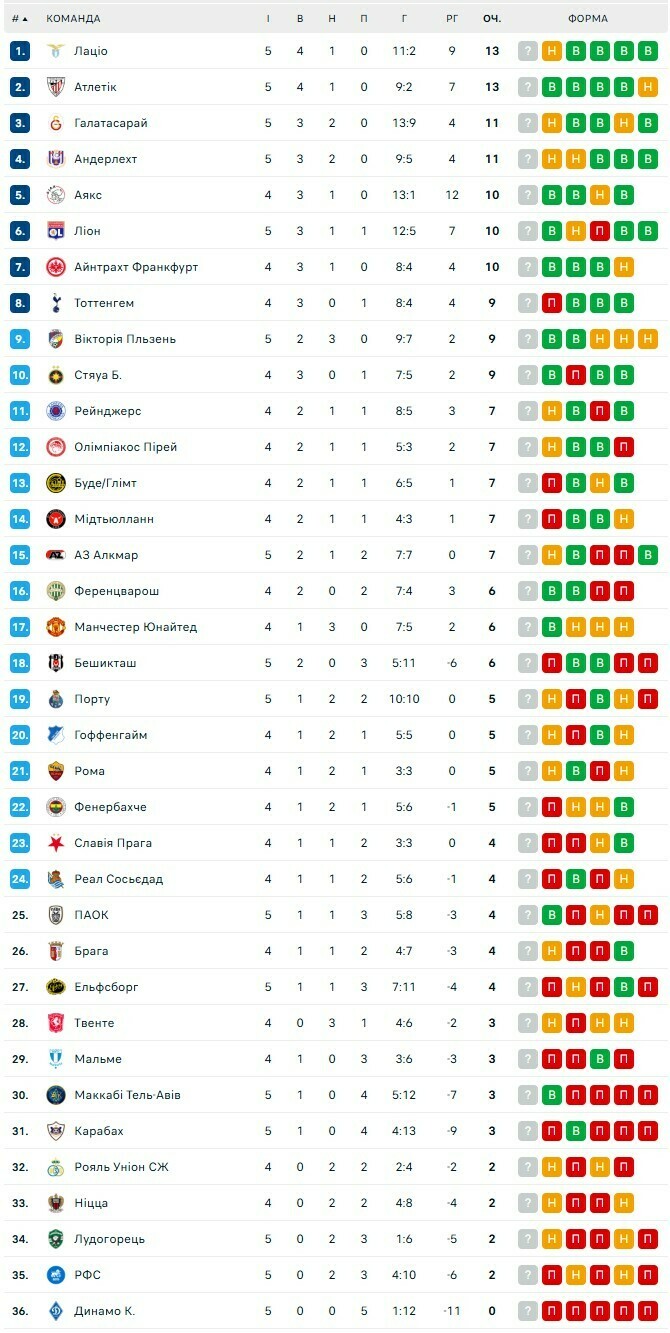 Киевская команда после 5 туров не имеет очков и занимает последнее 36-е место в турнирной таблице ЛЕ.