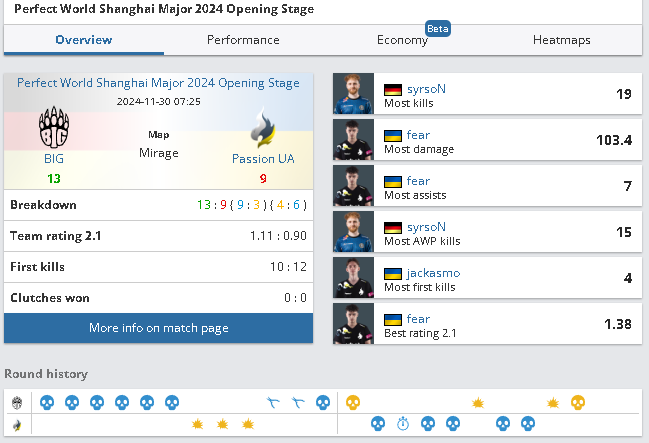 Начало было очень сложным для Passion UA, ведь первые шесть раундов забрали ребята из BIG, после тактической паузы, уже противникам нужно было сейвить девайсы в трех раундах, однако немецкие игроки быстро адаптировались и сделали три классных ритейка.