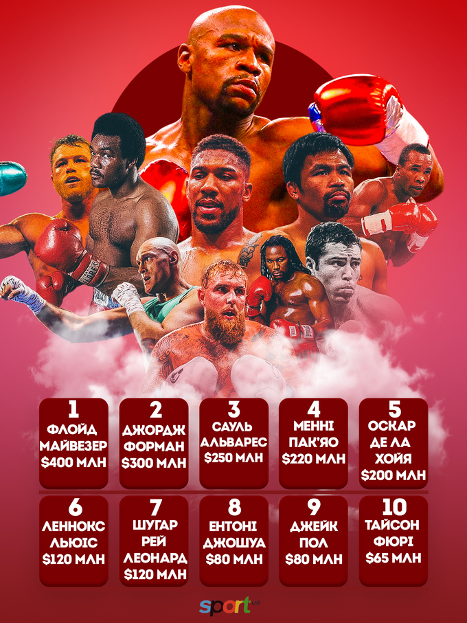 Возглавил рейтинг бывший чемпион мира Флойд Мейвезер, состояние которого оценивается в 400 млн долларов. Второе место занял легендарный боксер Джордж Форман (300 млн долларов). Интересно, что в рейтинге не оказалось украинского чемпиона Александра Усика, однако в десятке нашлось место его сопернику – британцу Тайсону Фьюри.