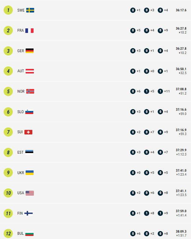 - 1. Швеция (Элла Халварссон / Себастьян Самуэльссон – 36:17.6 (0+4)