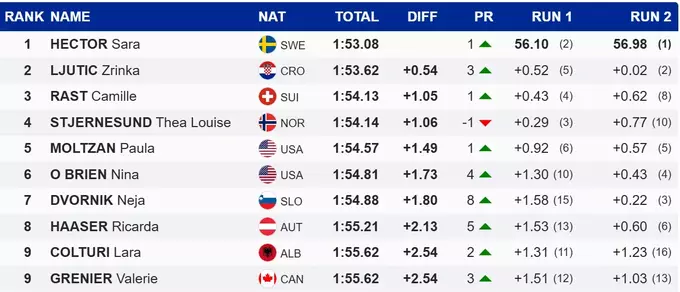 С общим временем 1:53.08 золотую медаль завоевала олимпийская чемпионка в гиганте Сара Хектор. Шведка оторвалась от серебряного призера Зринки Лютич из Хорватии на 0.54 секунды.