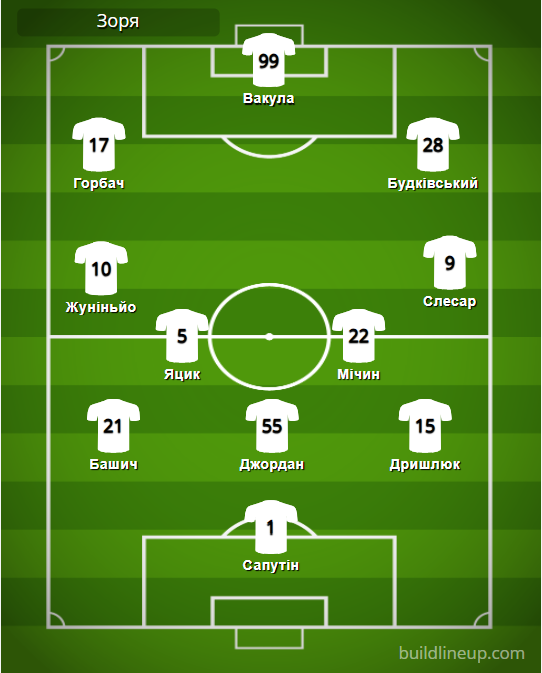 «Заря»: Сапутин – Башич, Джордан, Дрышлюк (Эскинья, 82) – Жуниньо, Яцик, Мичин (Кораблин, 90), Слесар (Кирюханцев, 46) – Горбач (Задорожный, 82), Будковский (Гусев, 90+2), Вакула.