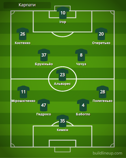 «Карпаты»: Кемкин – Мирошниченко, Педросо, Бабогло, Полегенько – Бруниньо, Альварес, Чачуа – Костенко (Пидлепенец, 75), Игор (Устименко, 75), Очеретько (Стенио, 82).
