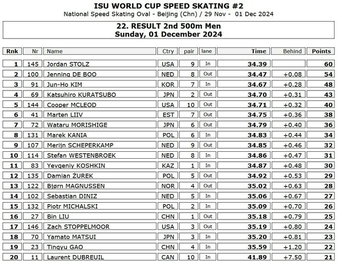 Американец Джордан Столц выиграл вторую гонку этапа на 500 метров и одержал 13-ю победу за две недели. На этот раз – без рекорда, но на «пятисотке» Столц рекорд трека уже поставил в пятницу. Йеннинг де Бо из Нидерландов занял второе место с отставанием от Столца в 0.08 секунды, а кореец Ким Джун Хо замкнул призовую тройку.