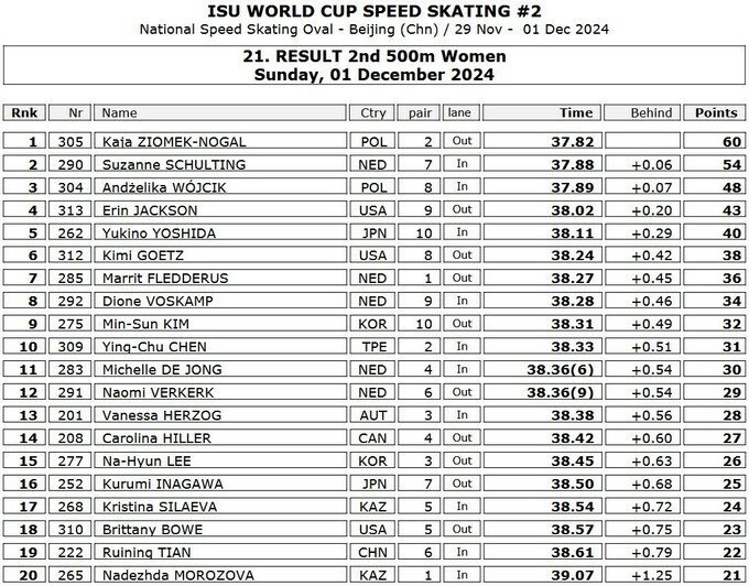 В женской гонке на 500 метров свою первую в карьере победу одержала польская спортсменка Кайя Земек-Ногаль в очень плотной борьбе. Легенда шорт-трека Сюзанна Схюлтинг отстала от Земек-Ногаль на 0.06 секунды, а еще одна конькобежка из Польши Анджелика Вуйчик проиграла звездной нидерландке 0.01 секунды и стала третьей.