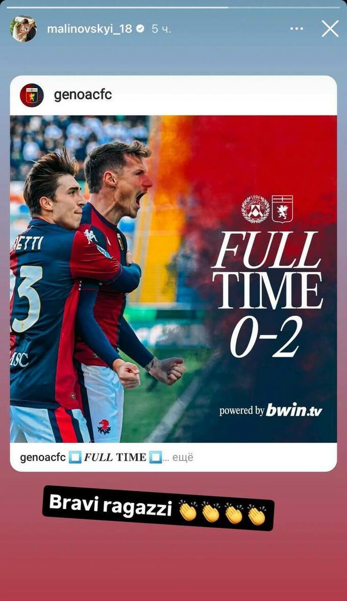«Браво, ребята!», – лаконично написал Малиновский, опубликовав stories в Instagram.