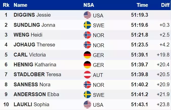 Действующая обладательница Большого хрустального глобуса Джессика Диггинс из США оказалась на первом месте пьедестала. Спортсменка для триумфа потратила 51:19.3 минуты. Серебряный призер – шведка Йонна Сундлинг, третье место за норвежкой Хейди Венг.