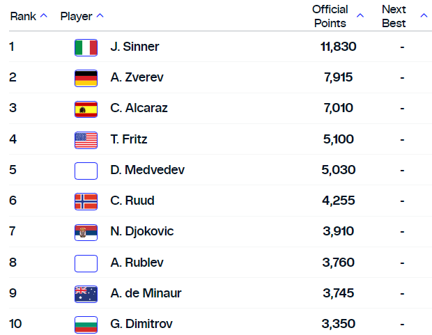 Янник Синнер завершит сезон первой ракеткой. На втором месте – Александр Зверев, топ-3 замкнул Карлос Алькарас.