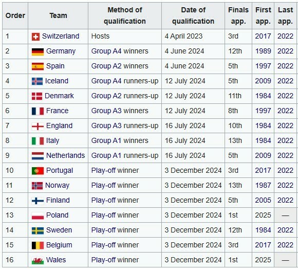 По итогам группового этапа квалификации путевки в ЧЕ получили по две лучшие команды каждой группы Лиги А: Дания, Англия, Франция, Германия, Исландия, Италия, Нидерланды и Испания. Еще одним участником является сборная хозяев – Швейцарии.