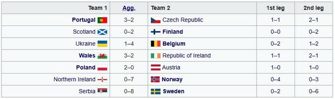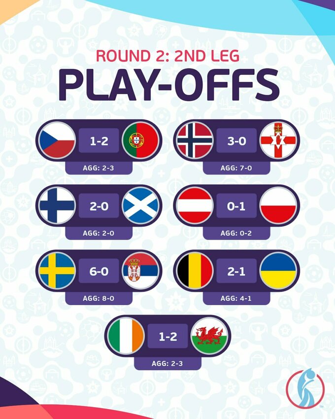 Еще 7 путевок были разыграны во втором раунде плей-офф, их обладателями стали Португалия, Норвегия, Польша, Финляндия, Швеция, Бельгия, Уэльс.