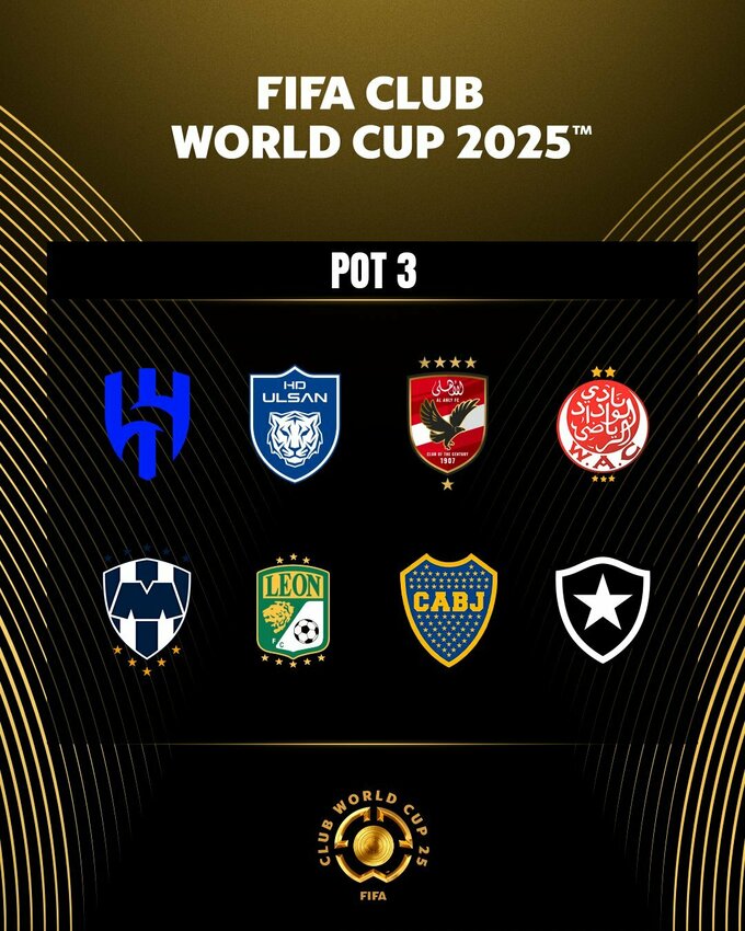 - Корзина 3: Аль-Хиляль (Саудовская Аравия), Ульсан Хюндай (Южная Корея), Аль-Ахли (Египет), Видад (Марокко), Монтеррей (Мексика), Леон (Мексика), Бока Хуниорс (Аргентина), Ботафого (Бразилия)