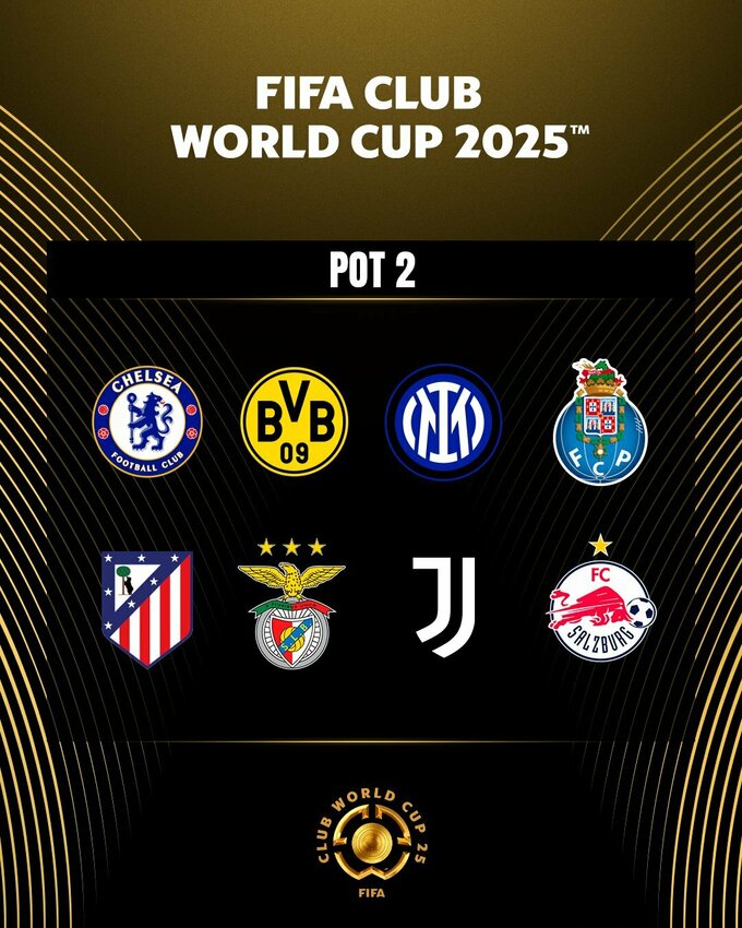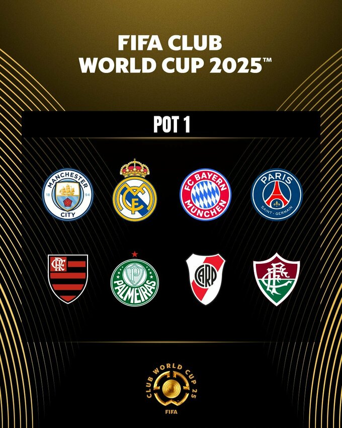 - Корзина 1: Манчестер Сити (Англия), Реал Мадрид (Испания), Бавария (Германия), ПСЖ (Франция), Фламенго (Бразилия), Палмейрас (Бразилия), Ривер Плейт (Аргентина), Флуминенсе (Бразилия)