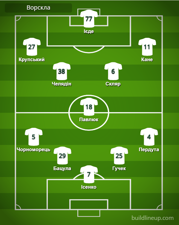 «Ворскла»: Исенко (Домолега, 67) – Черноморец, Бацула, Гучек, Пердута – Челядин (Нестеренко, 54), Павлюк, Скляр – Крупский, Иеде (Островский, 80), Кане.