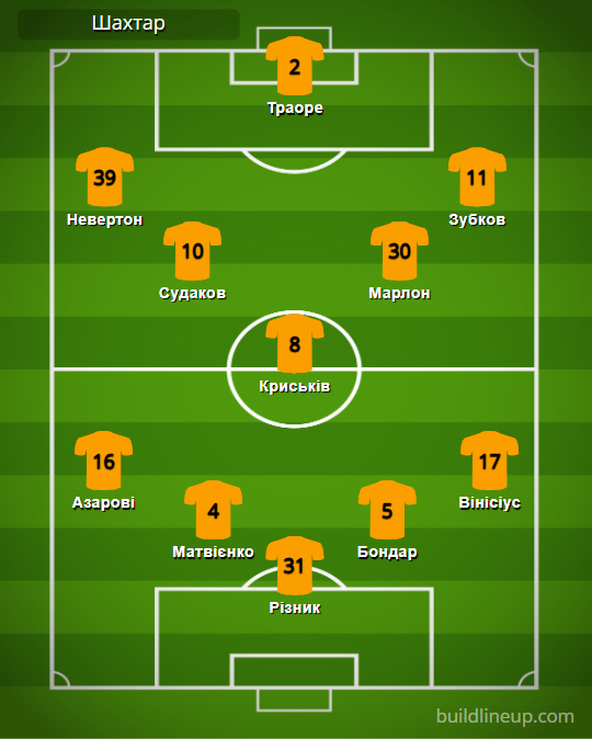 «Шахтер»: Ризнык – Азарови (Фарина, 90+2), Матвиенко, Бондарь, Винисиус – Судаков (Степаненко, 72), Крыськив (Назарина, 72), Марлон (Педриньо да Силва, 73) – Невертон, Траоре, Зубков (Швед, 55).