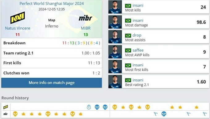 Сегодня, 5 декабря, состоялась вторая Bo1 игра украинского клуба Natus Vincere. Оппонентом желто-черных стали молодые бразильцы из MIBR. Невероятный матч закончился со счетом 11:13 в пользу Made in Brasil на карте Inferno.