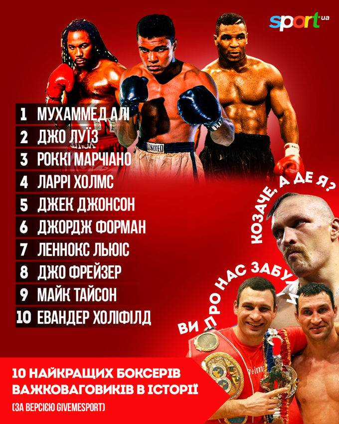В десятку рейтинга попали Джордж Форман, Леннокс Льюис, Джо Фрейзер, Майк Тайсон и Эвандер Холифилд. Легендарные братья Кличко и последний за 24 года абсолютный чемпион в хевивейте Александр Усик в рейтинг не попали.