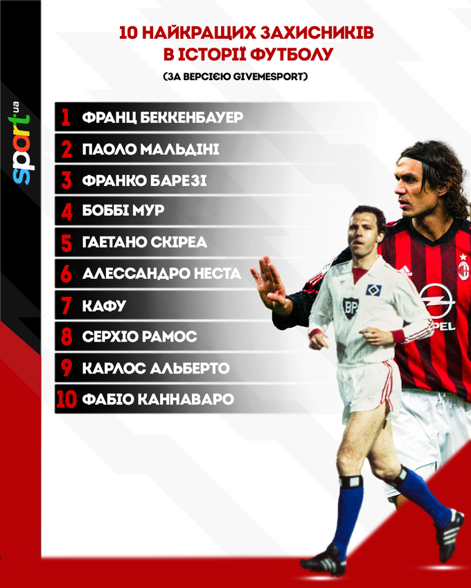 На первой строчке разместился легендарный защитник «Баварии» и сборной Германии Франц Беккенбауэр, который является двукратным обладателем Золотого мяча. На второй позиции идет икона «Милана» и всего итальянского футбола Паоло Мальдини, бронза списка досталась еще одной легенде «Милана» Франко Барези.