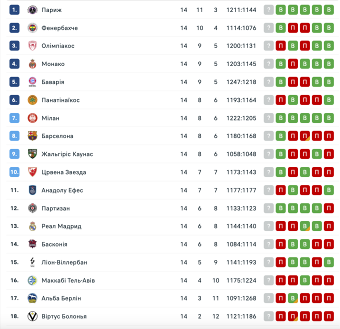 6 декабря состоялись четыре матча 14-го тура баскетбольной Евролиги.
