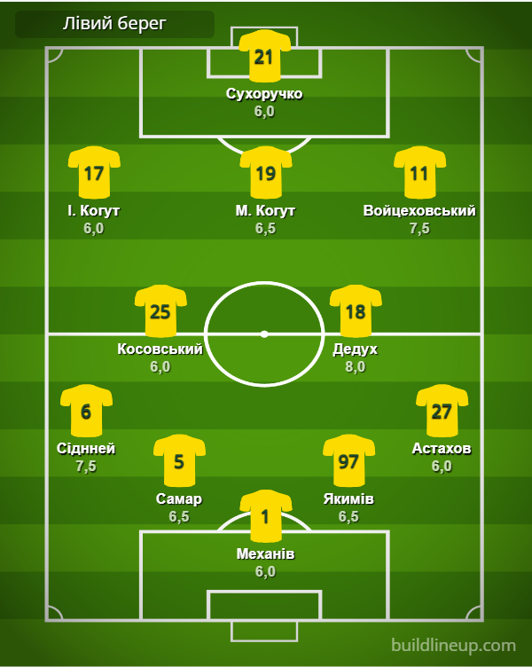«Левый Берег»: Механив – Сидней, Самар, Якимов, Астахов – Косовский (Приходько, 72), Дедух – И. Когут (Галас, 71), Н. Когут (Спиваков, 61), Войцеховский (Шаповал, 81) – Сухоручко.