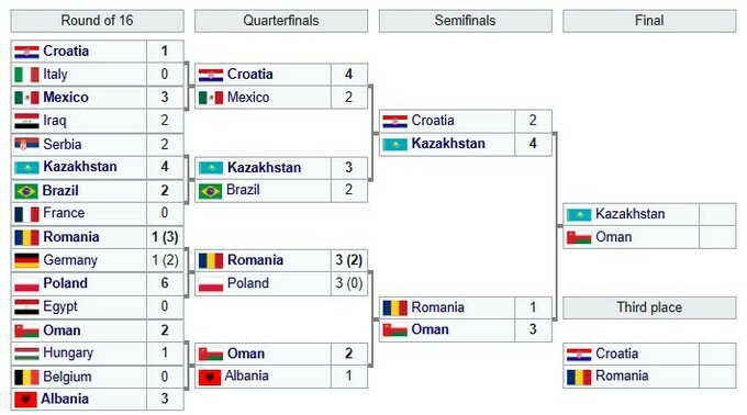 В решающем матче сыграют команды Казахстана и Омана, а бронзовые медали разыграют Хорватия и Румыния.