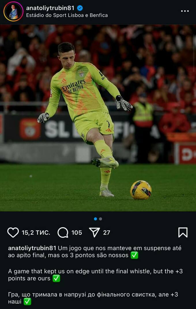 Украинский голкипер «Бенфики» Анатолий Трубин в своем Инстаграм прокомментировал матч 13-го тура чемпионата Португалии, в котором «Бенфика» обыграла «Виторию Гимараеш» со счетом 1:0: